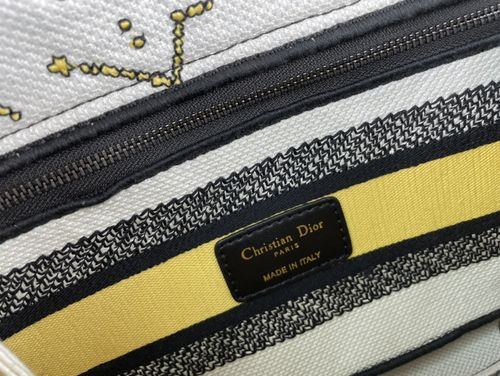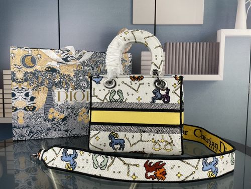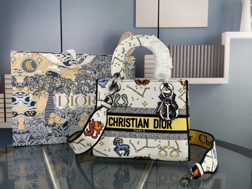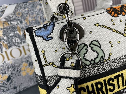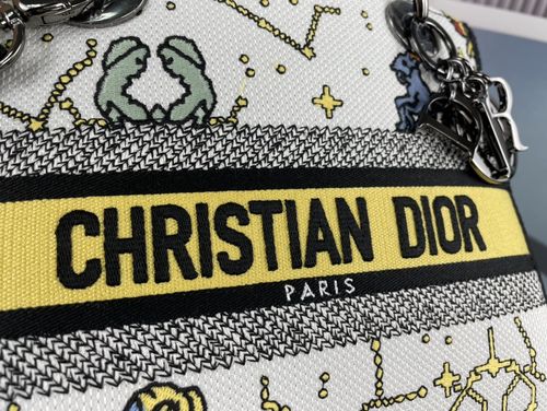 The Lady D-Lite bag combines classic elegance with House modernity. Fully embroidered with the multicolor Dior Jardin Botanique motif, it features a romantic floral pattern inspired by Mr. Dior's beloved Granville Gardens. The front features a 'CHRISTIAN DIOR PARIS' signature while the 'D.I.O.R.' charms in pale gold-finish metal embellish and illuminate the silhouette. Equipped with a wide, reversible, and removable embroidered shoulder strap, the medium Lady D-Lite bag can be carried by hand or worn crossbody.