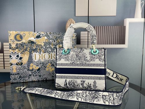 The Lady D-Lite bag combines classic elegance with House modernity. The style is fully embroidered with the blue Toile de Jouy Reverse motif, a variation of the hallmark House pattern with a play on reversed colors. The front features a 'CHRISTIAN DIOR PARIS' signature while the thick 'D.I.O.R.' charms in pale gold-finish metal enhance the silhouette. Equipped with a wide, reversible and removable embroidered shoulder strap, the medium Lady D-Lite bag can be carried by hand or worn crossbody.